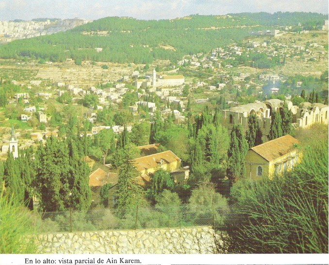 Ain Karem, que significa "fuente del viñedo", está situado muy cerca de la ciudad nueva de Jerusalén (Ver NOTA 3), no lejos de Belén, y queda a unos 6 Km de la puerta de Jafa (la Jerusalén antigua) y puesto que el servicio del Templo se realizaba en turnos, como hemos visto, de una semana, parece lógico y razonable pensar que Zacarías residiría en su casa cuando no estaba de servicio en el Templo, y probablemente la semana del servicio le obligaba a permanecer en él todo el tiempo (Lc 1, 23)