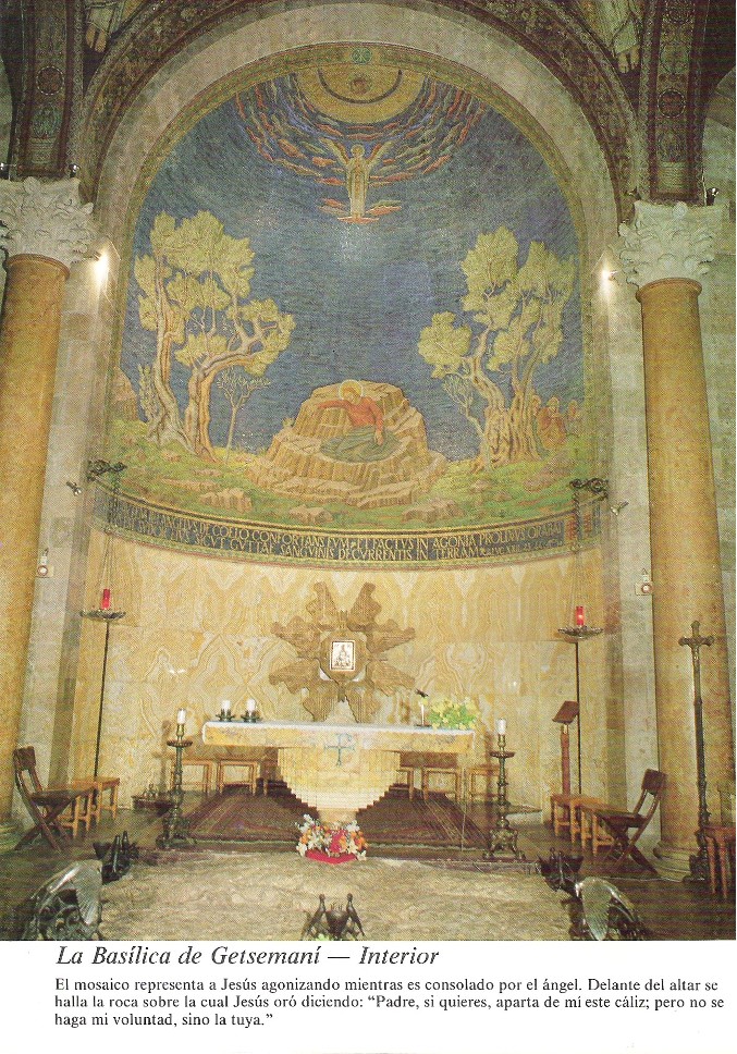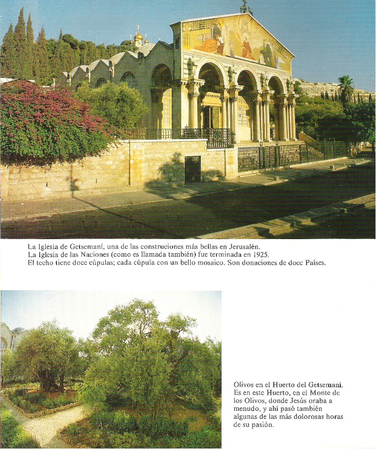 En Getsemaní hay una iglesia de construcción moderna, denominada "de las Naciones" porque se construyó con donativos internacionales. En ella se venera una roca, de las muchas que afloran en la superficie del lugar, como aquella que recibió el sudor de Sangre de Jesús en oración. Se encuentra junto a un jardín que cuidan los Franciscanos, que contiene varios olivos milenarios. No son contemporáneos de Jesucristo, no es probable que tengan más de mil quinientos años, pero la veneración de los Peregrinos los mira con la misma devoción que si lo fueran. La roca puede haber sido otra, de las que se ven en el exterior, y los olivos no son los mismos, pero el lugar es el mismo con absoluta seguridad y los hechos narrados por el Evangelio ocurrieron allí.
