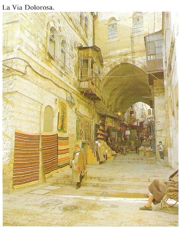 Los Peregrinos de Jerusalén practican la devoción del Vía Crucis por estas calles, en las que están marcadas algunas estaciones con pequeñas capillas adosadas a los edificios. Pero aunque no sea el mismo, el recorrido sin duda recuerda lo que debió ser. Las calles estrechas y algo empinadas, con escalones en algunos casos, cruzan una especie de zoco comercial, lleno de tiendas y abarrotadas de visitantes. Los Peregrinos rezan y siguen su Vía Crucis entre la indiferencia de los que les rodean. Algo así debió ocurrirle también a Nuestro Señor al cruzar lo que parece fue un mercado, en el recorrido al Calvario. Unos le increpaban, otros sin duda le miraron con indiferencia y algunos, como las mujeres que cita el Evangelio, lloraban por El: "... Hijas de Jerusalén, no lloréis por Mí, llorad por vosotras mismas y por vuestros hijos ..."