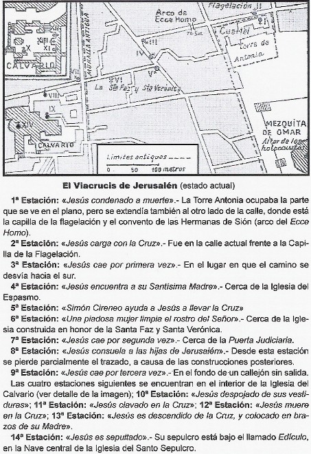 En este dibujo comentado se observa el recorrido, realizado sobre el trazado actual de las calles. Hay que hacer dos advertencias. En primer lugar que la Torre Antonia abarcaba más de lo que está representado, ya que los subterráneos recientemente descubiertos llegan a la altura del arco del Ecce Homo, y en segundo, aclarar que en la 9ª estación se habla de un callejón sin salida, y se refiere claro está al mencionado patio Etíope.