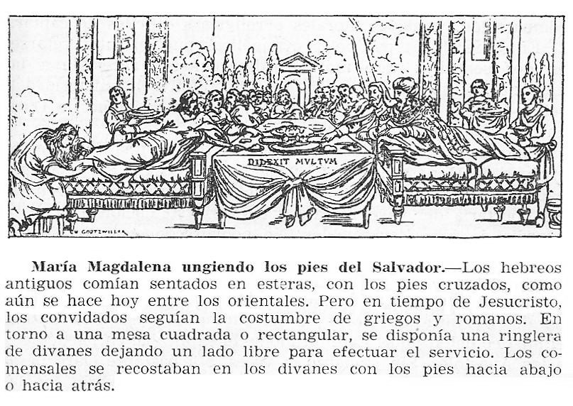 María se acerca a Jesús "por detrás, junto a sus pies". En el dibujo se aprecia perfectamente como es esto posible, pues los comensales comen "a la griega" echados sobre divanes. Esta actitud de María, llorando y perfumando los pies del Señor es la que luego veremos en María de Betania (Jn 12, 1-11), pero es sin duda una ocasión diferente, sea o no la misma persona.