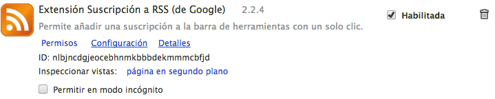puedes hacer clic con el botón derecho o ir a Configuración->Extensiones y en “Extensión Suscripción a RSS (de Google) hacer clic en “Configuración”.