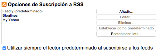 Guardas y cierras y marcas como predeterminada la opción de Feedly para que cuando aparezca el icono de RSS en la página que visitas y hagas clic, abrirá feedly para que puedas añadirla a una de tus categorías.