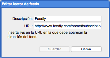 De esta forma accederás a la siguiente ventana donde debes “Añadir” y en el campo de descripción escribes Feedly por ejemplo y en la url debes de poner http://www.feedly.com/home#subscription/feed/%s