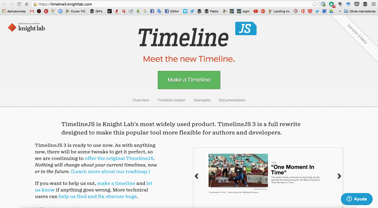 1. Visita la página web de Timeline JS3: https://timeline3.knightlab.com/ y verás que a diferencia de otras herramientas similiares, no necesitas abrir una cuenta, permitiendo ponerte manos a la obra de inmediato.